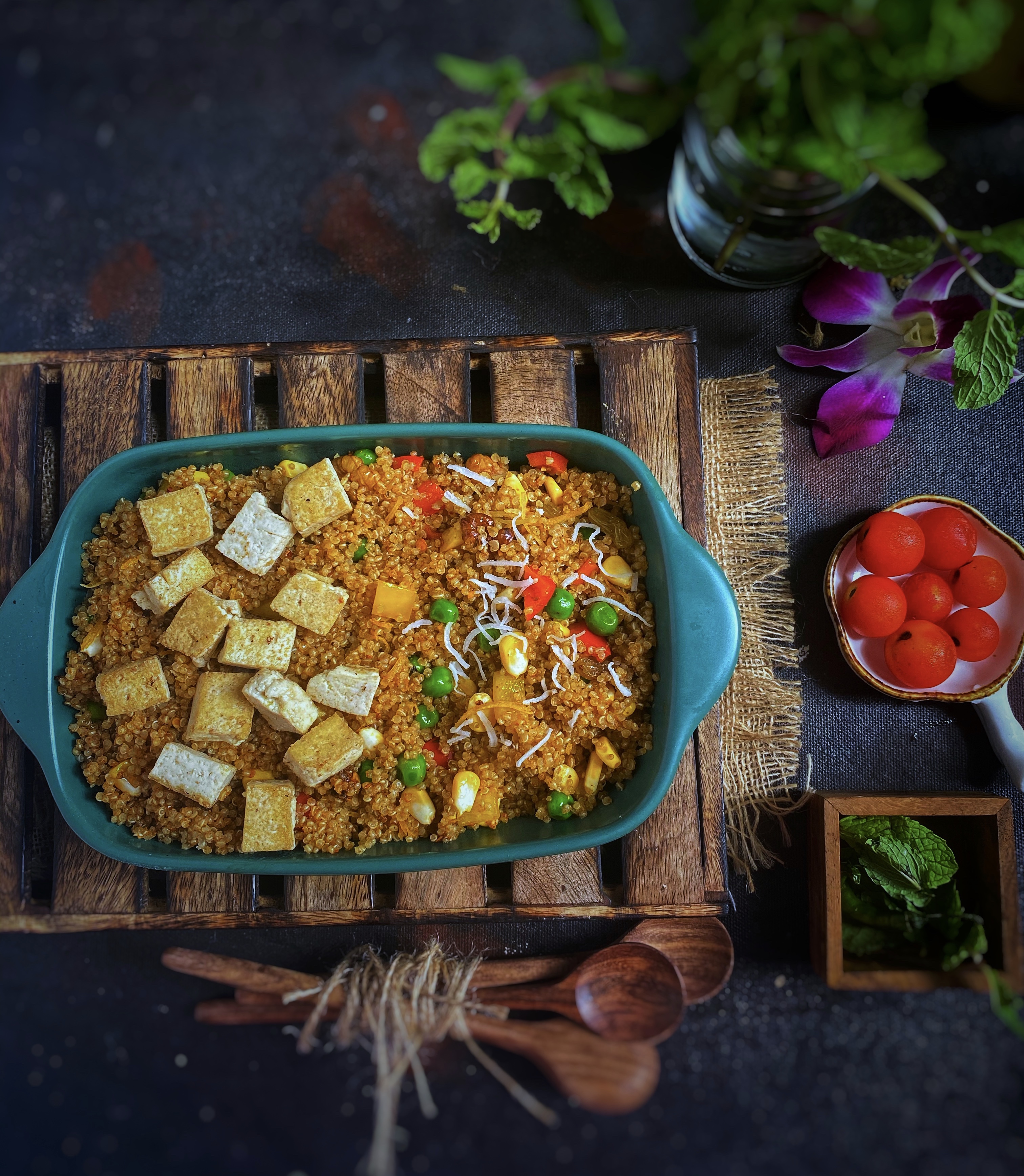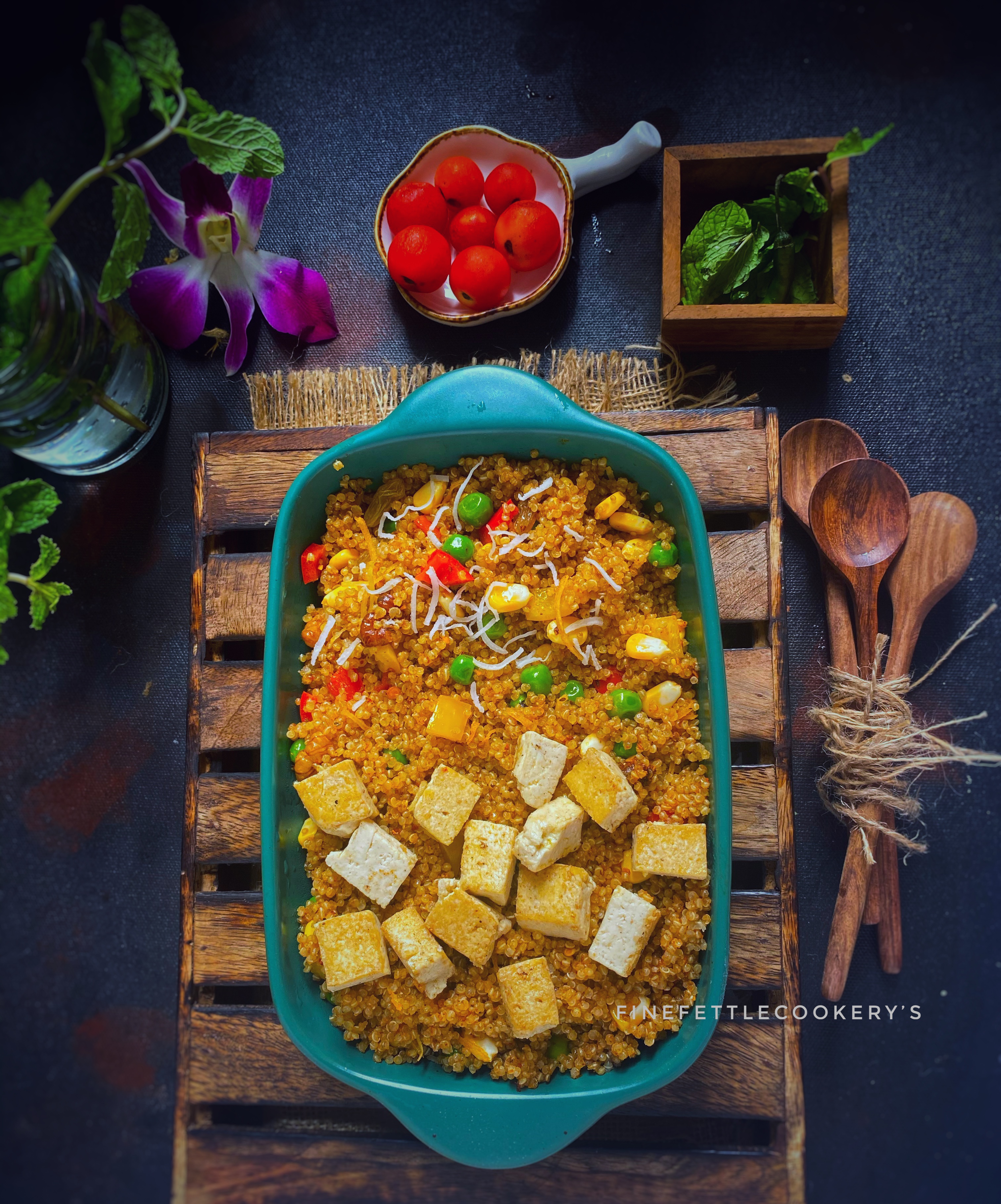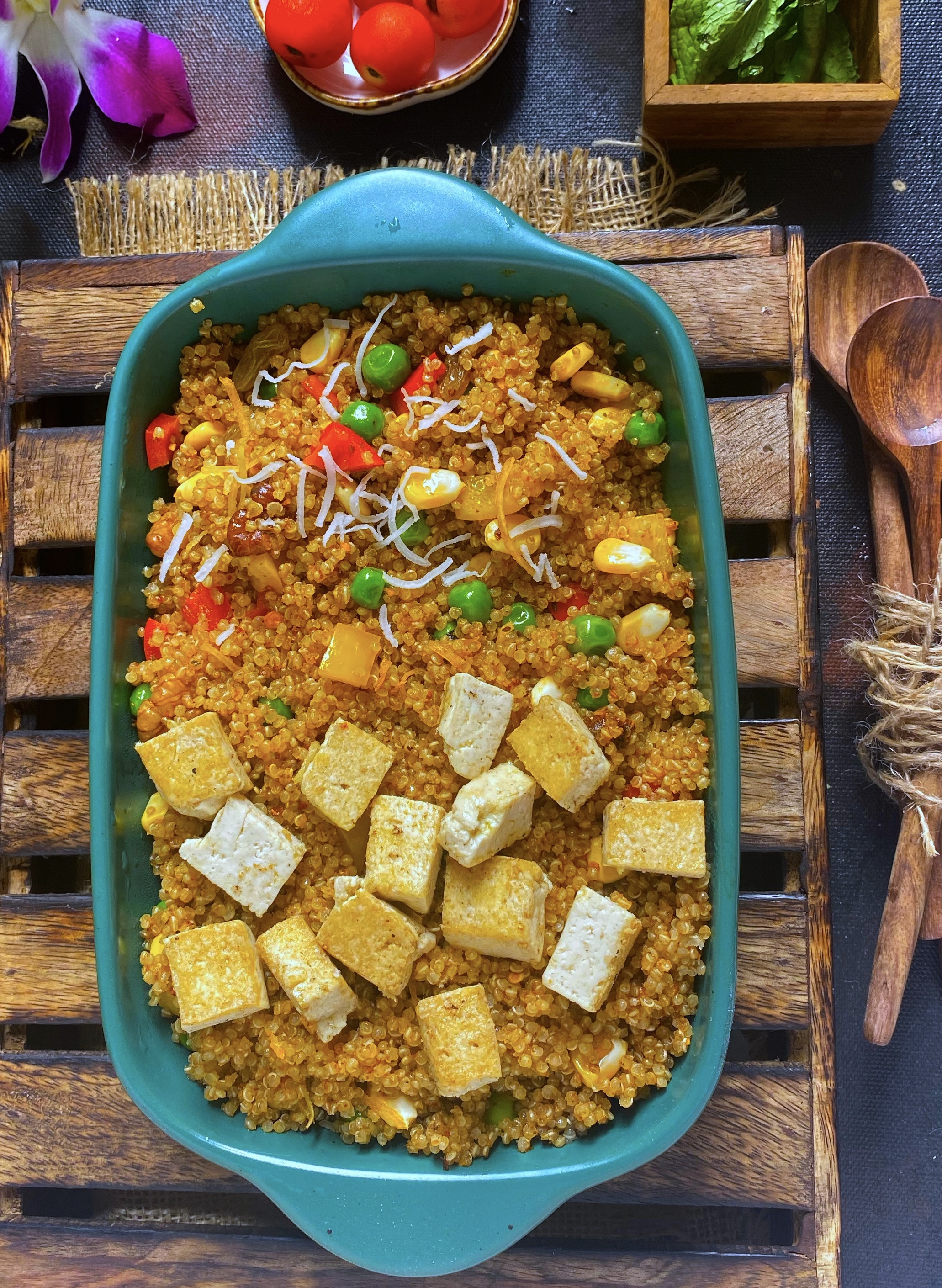 Add these veggies to quinoa and also add nuts and coconut shave, tofu.