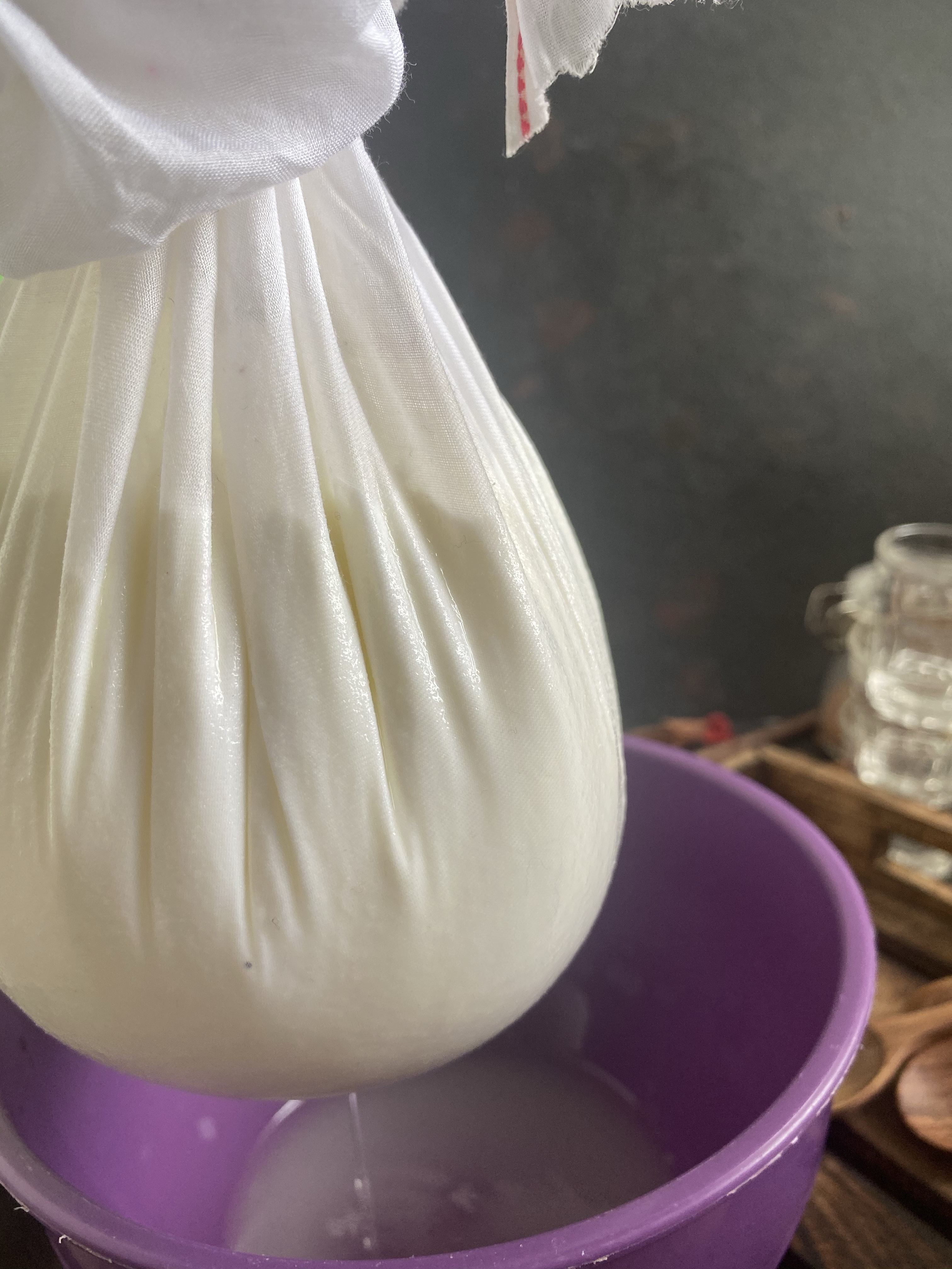 To make greek yogurt :Pour the plain yogurt in to cheese cloth like a photo. Hang it for 2-3 hrs you will get greek yogurt. (or to strain, line a mesh sieve with cheesecloth )