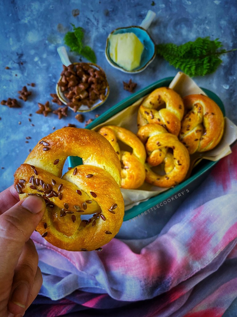 12. Butter wash the pretzels just before you bake them, Sprinkle with pretzel salt and flex seed.