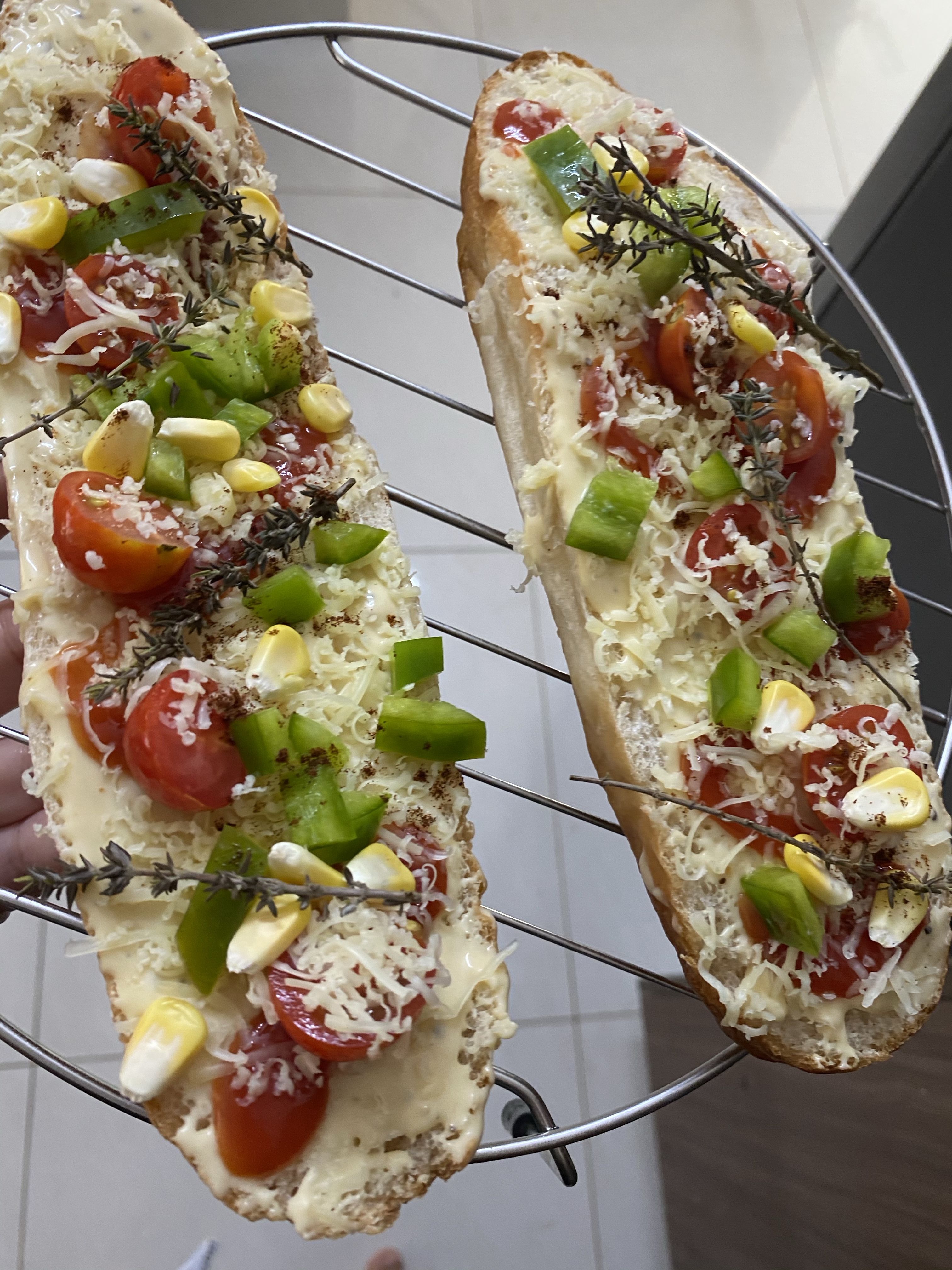 - On each half of the baguette, evenly spread the cooked mushrooms and onion to cover the cut side of the bread.