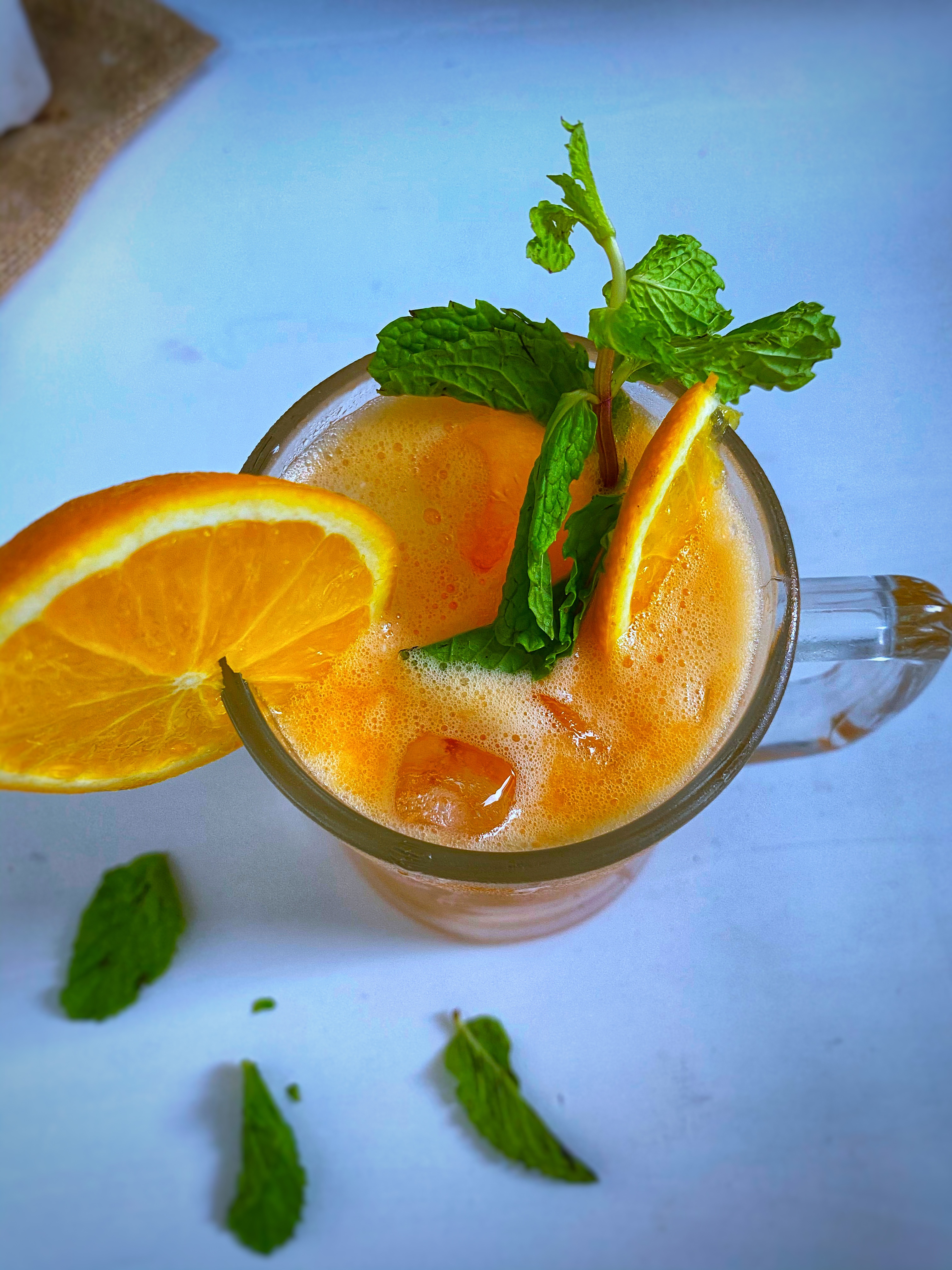 4. Pour the muskmelon orange juice. Garnish with mint leaves and orange slice serve chilled.