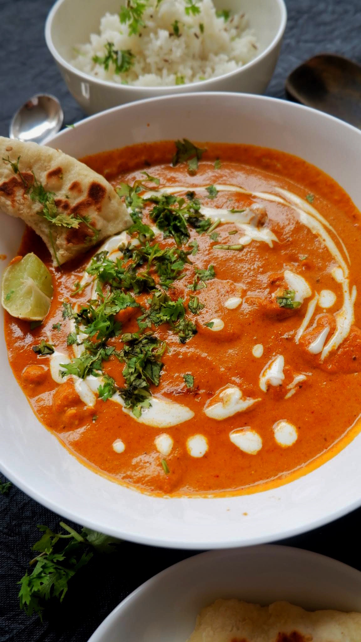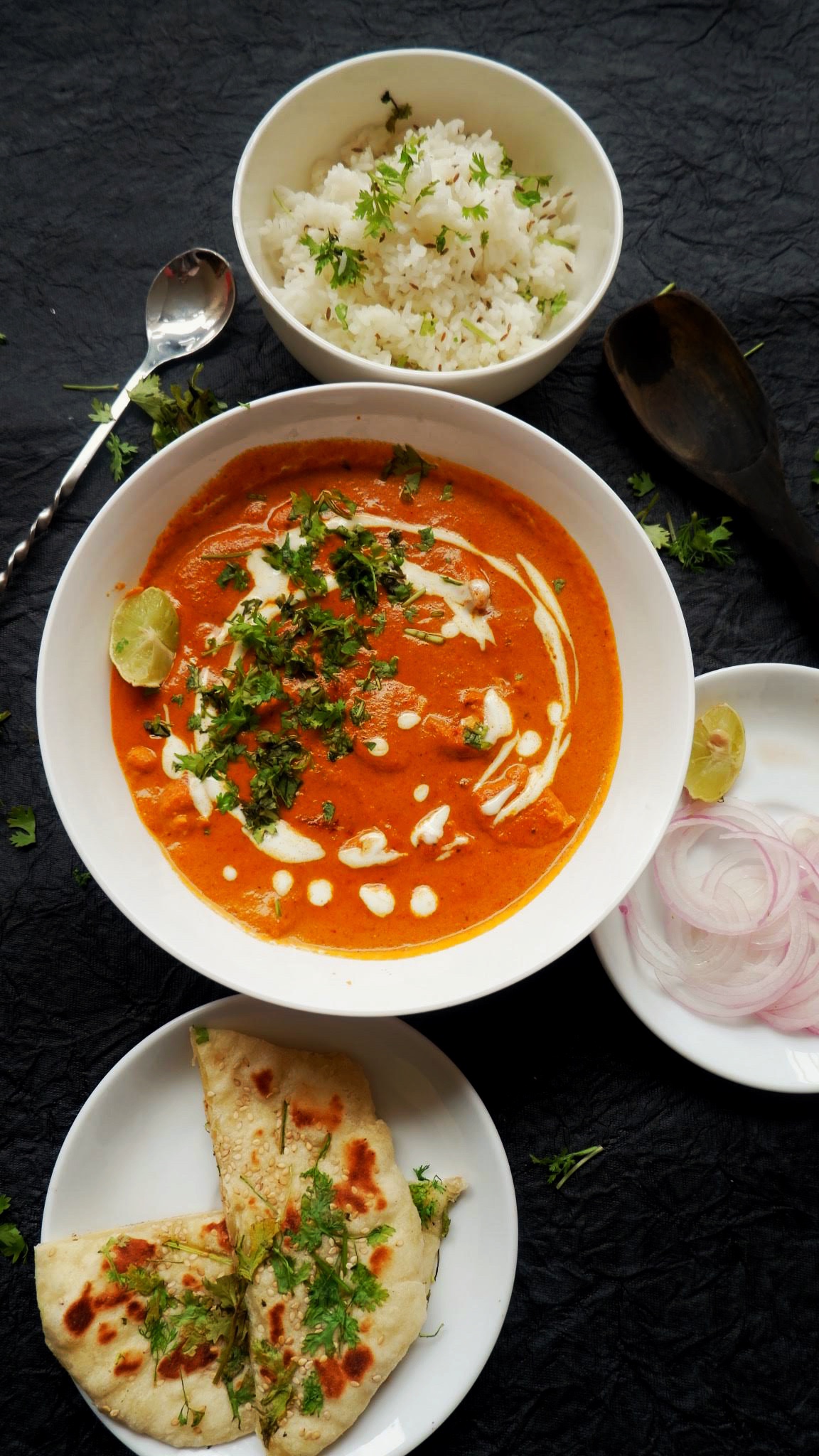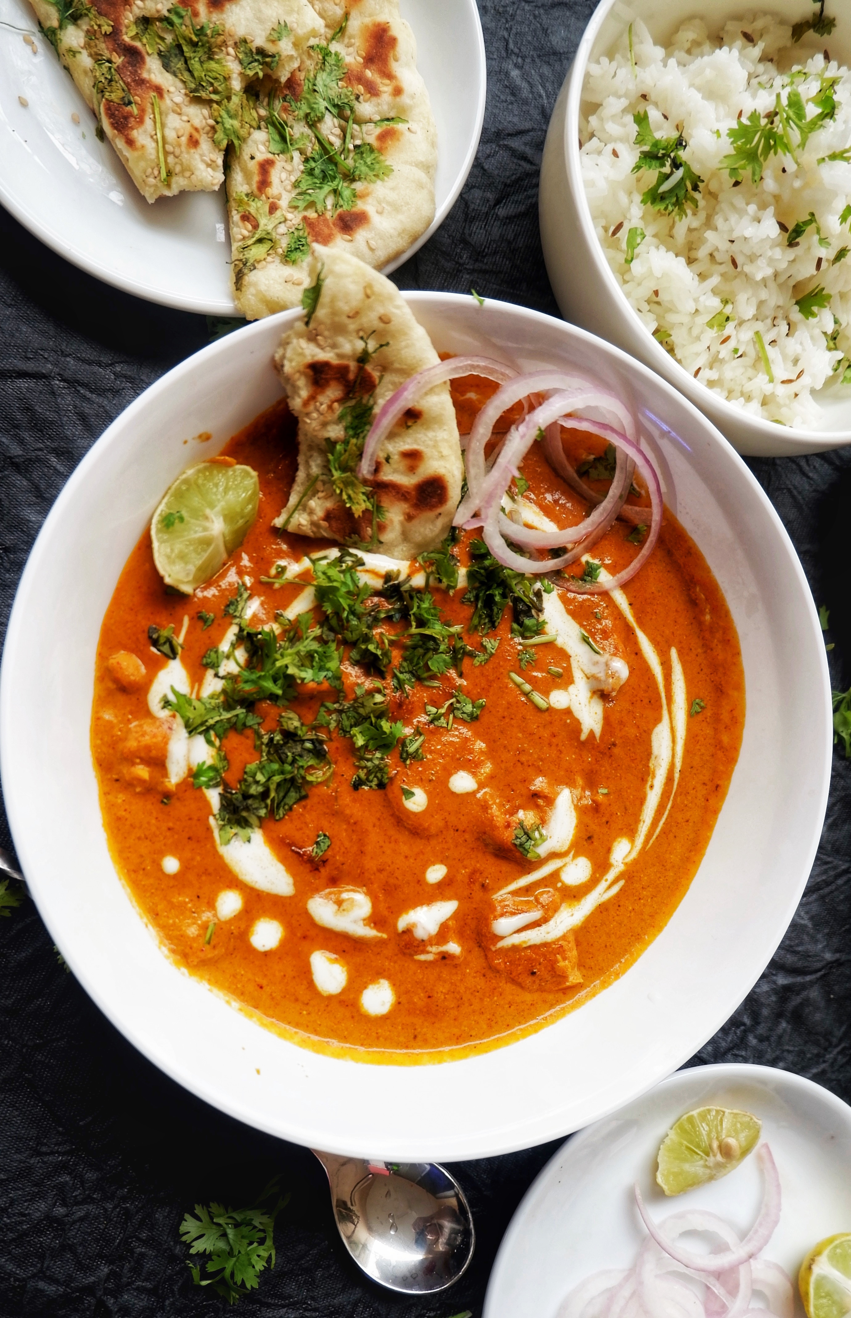 - Garnish butter chicken with coriander leaves and extra cream if desired. Serve with long grain rice or naan or paratha.