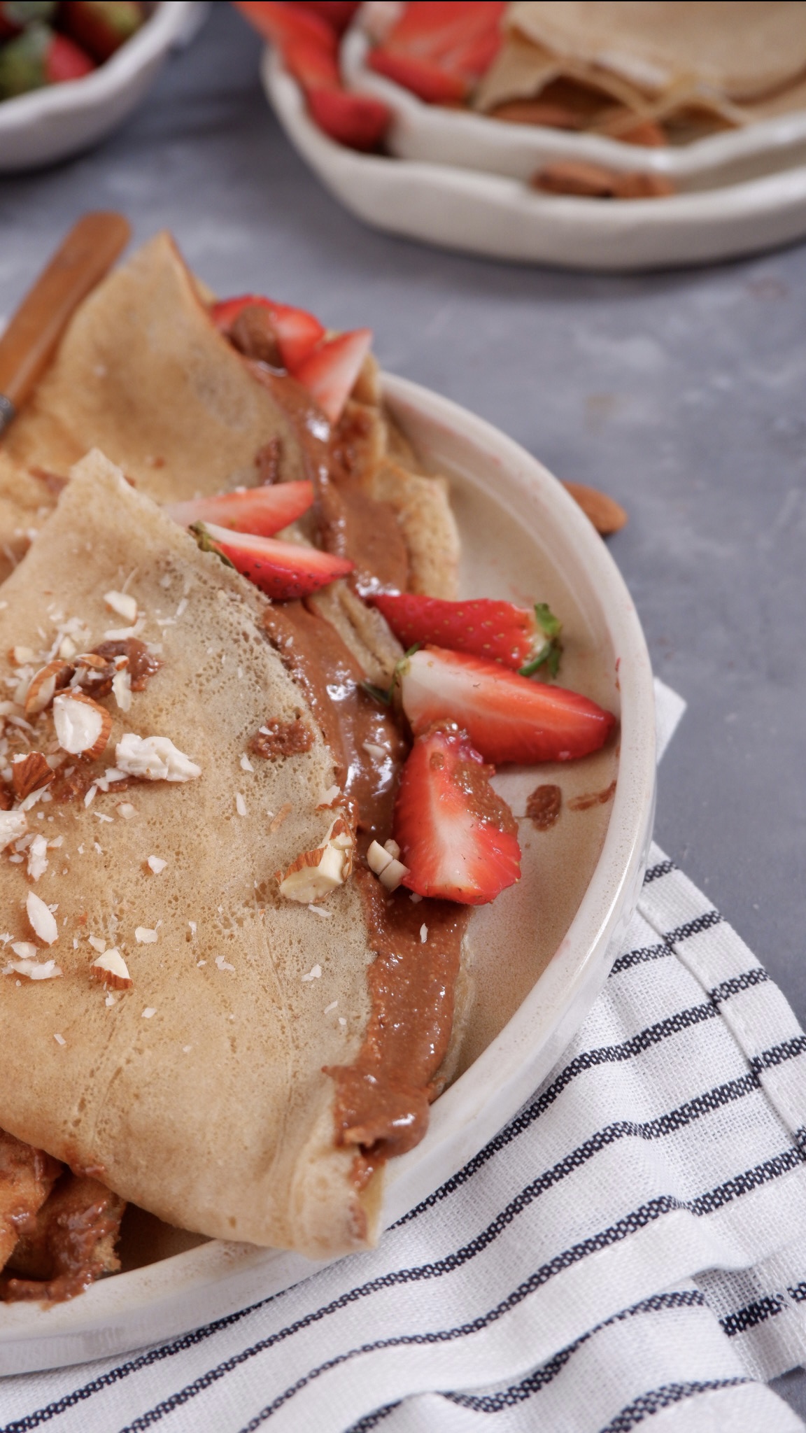 - Slide the pancake onto a plate apply choco almond butter and topped with fresh berries and chopped almond.