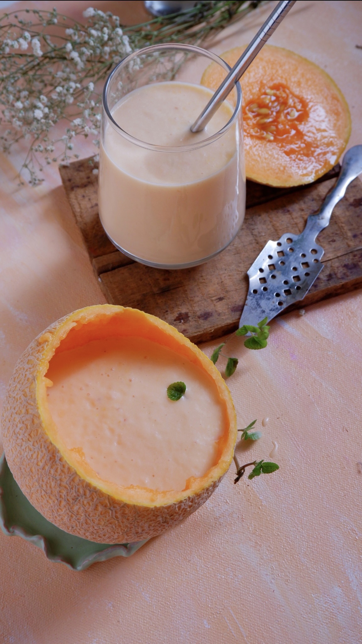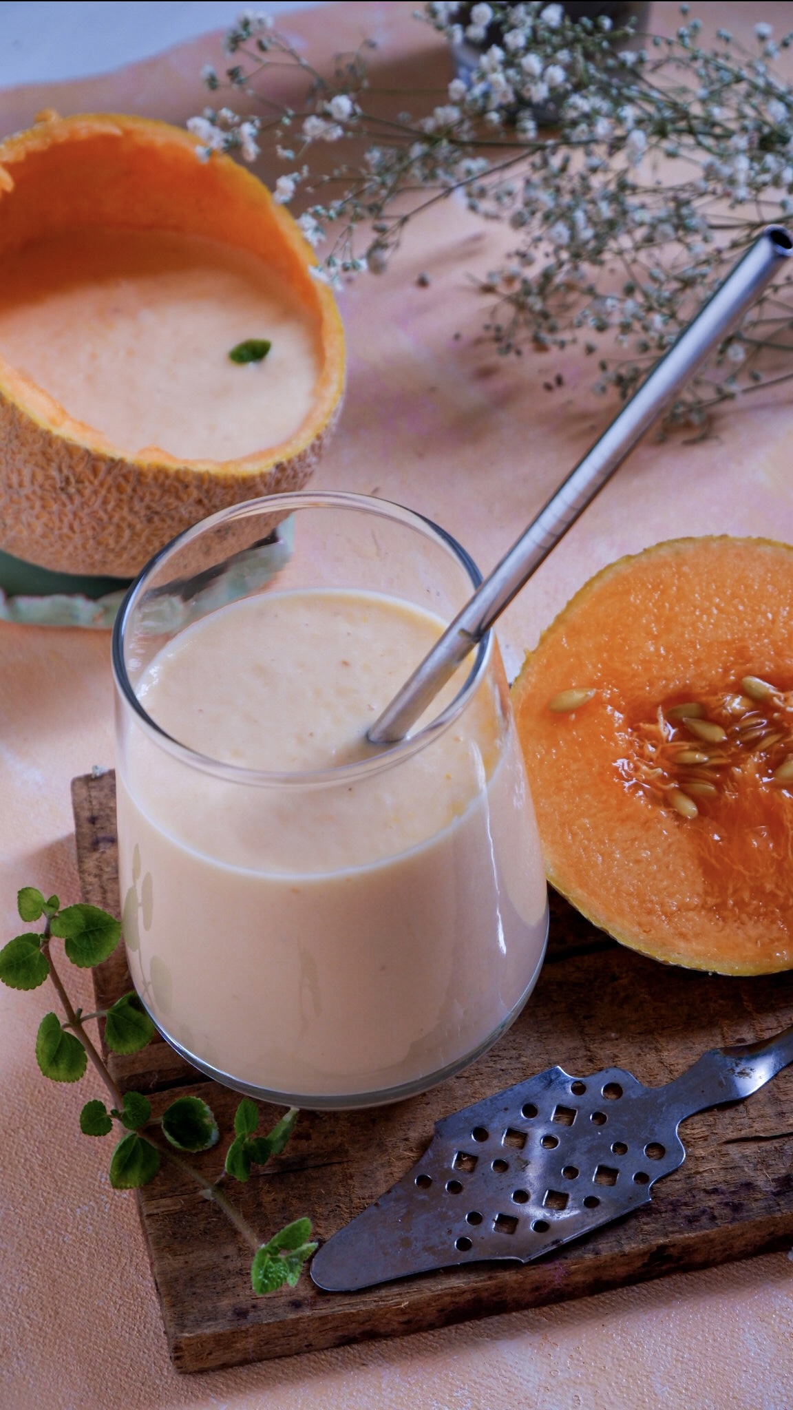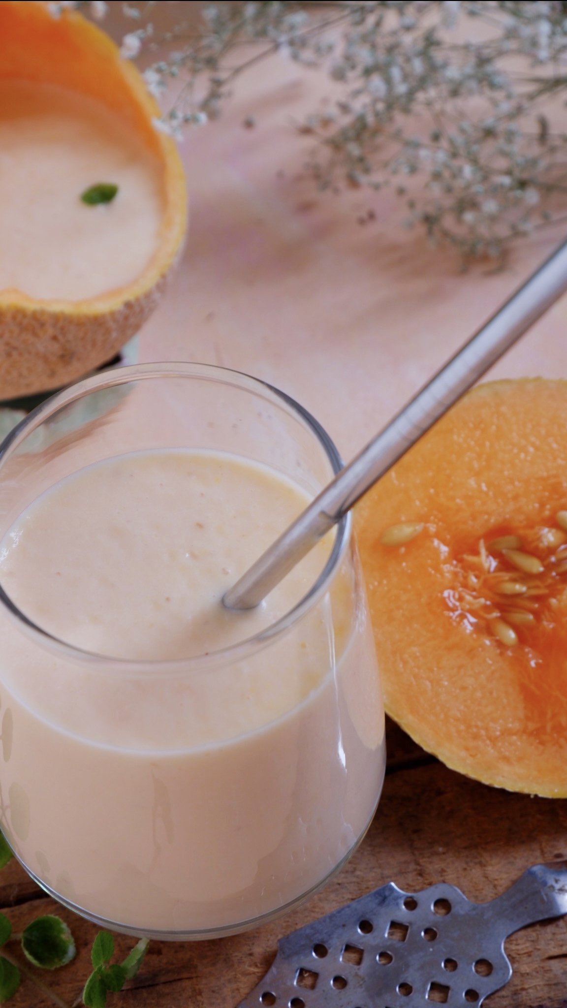 Muskmelon milkshake is a medium sweet drink made by blending milk and sweetener and the muskmelon.