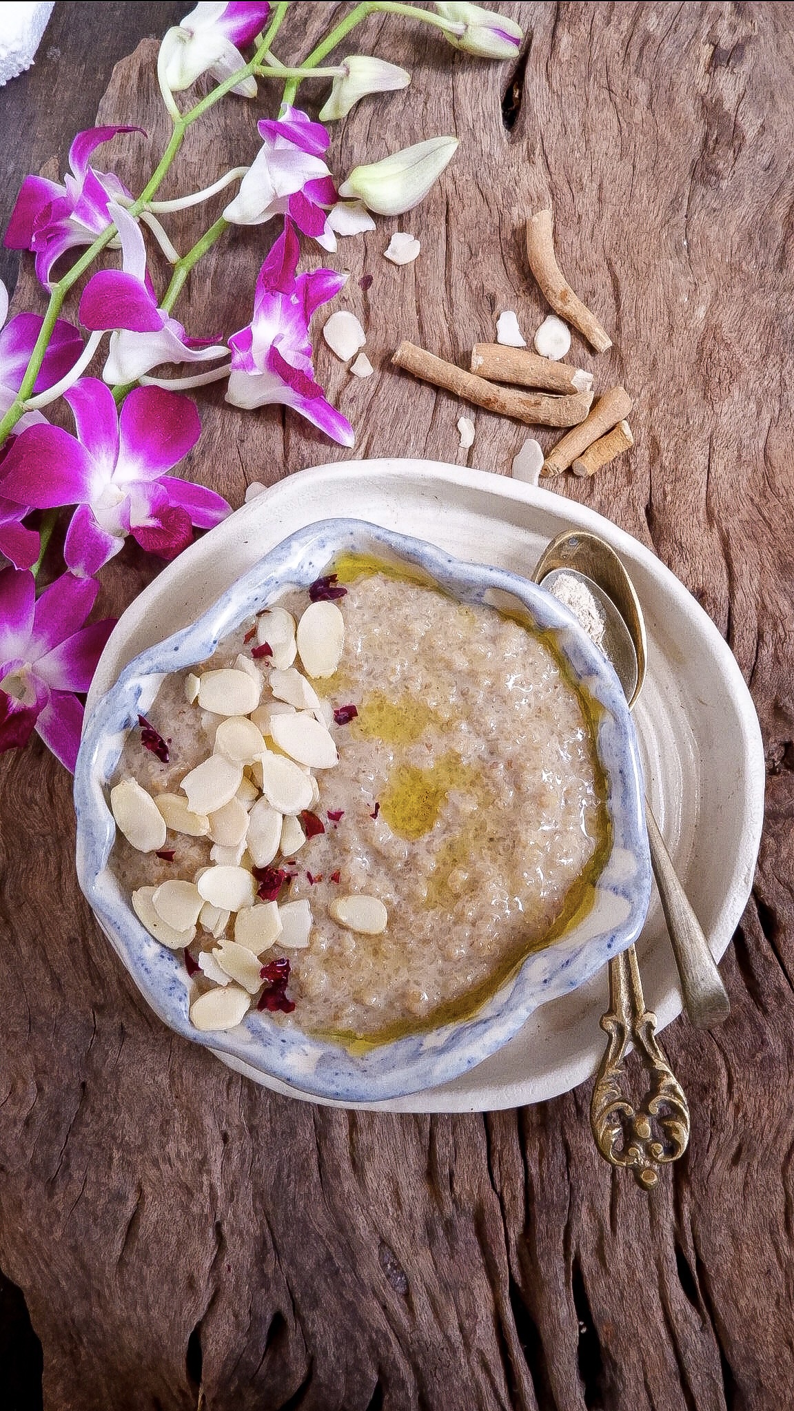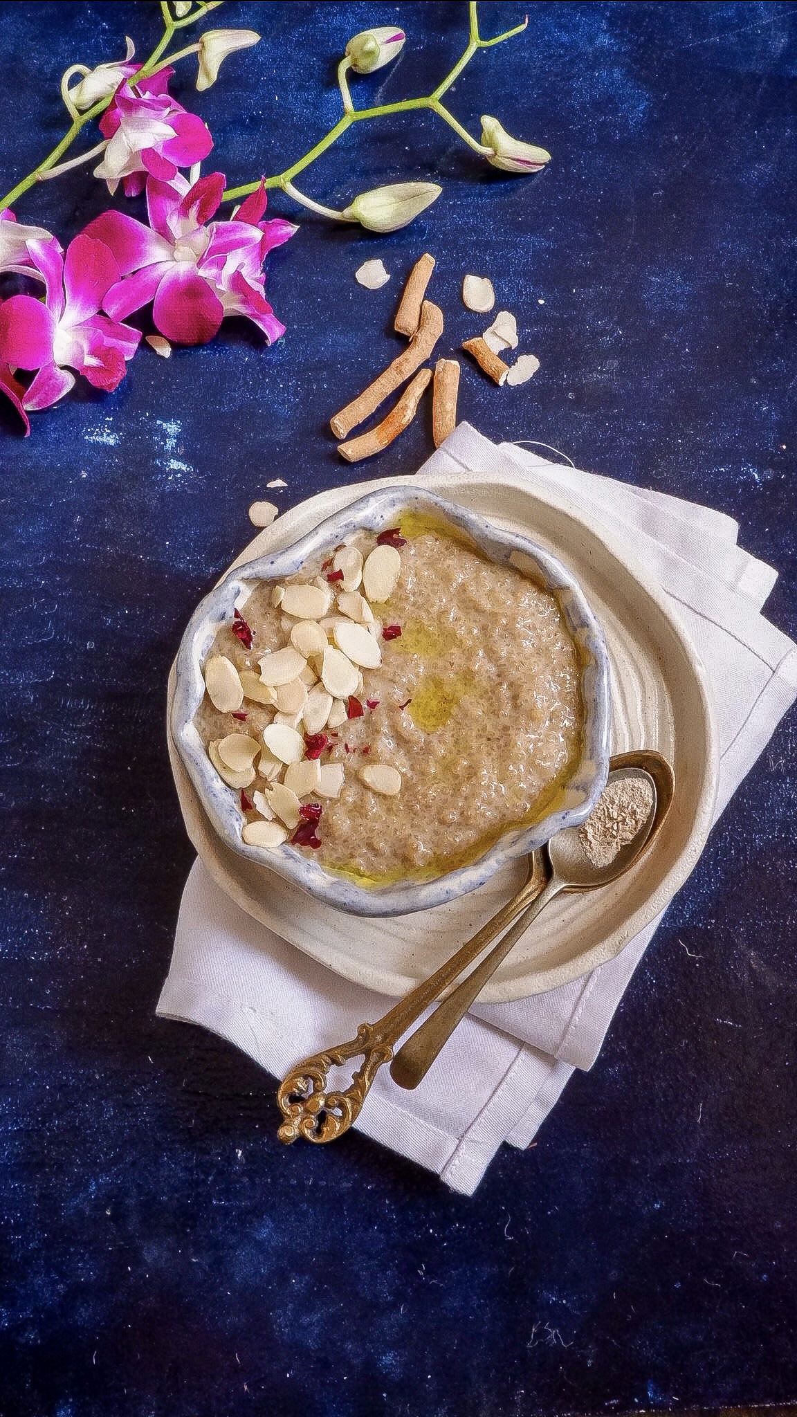- Garnish with almonds and rose petals.