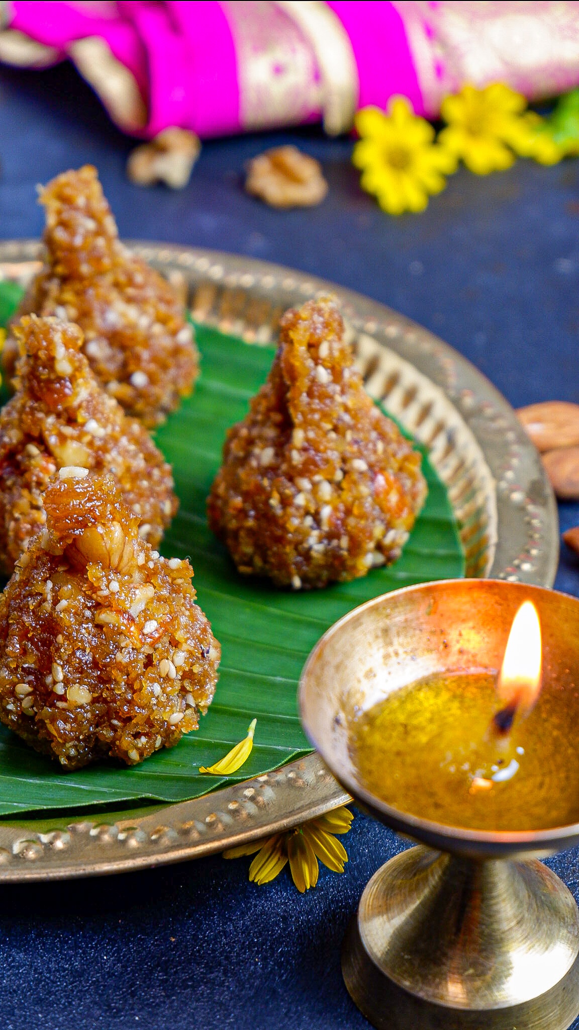 Walnut Coconut Modak is a Indian sweet made of freshly grated coconut, jaggery and walnuts, shaped in to Modak.