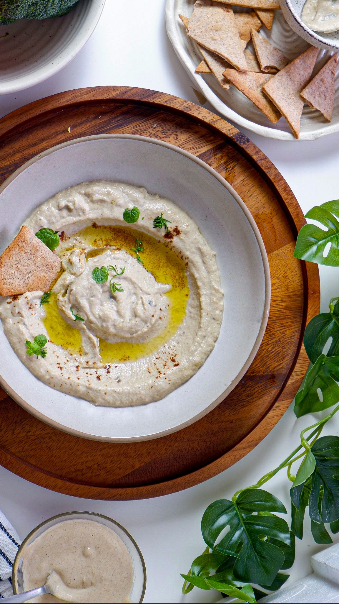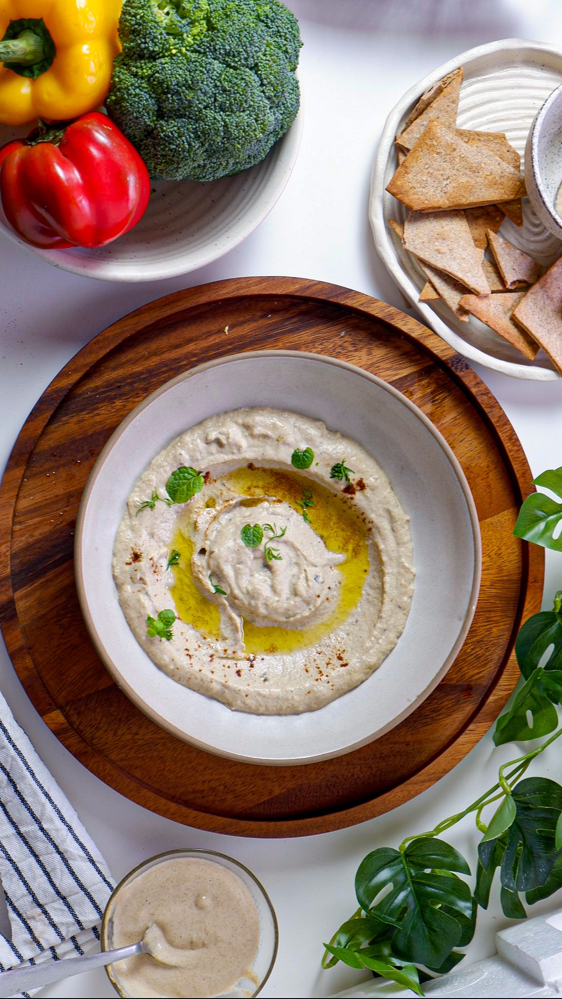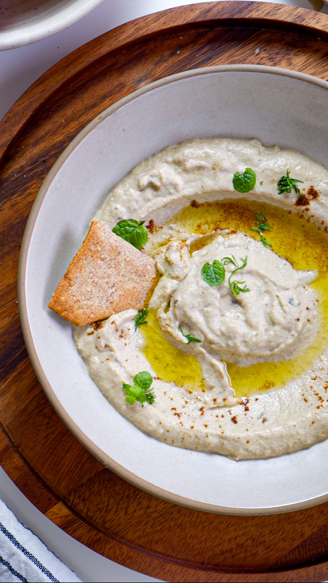 - Serve the mutabbal drizzled with olive oil and garnished with paprika and mint.