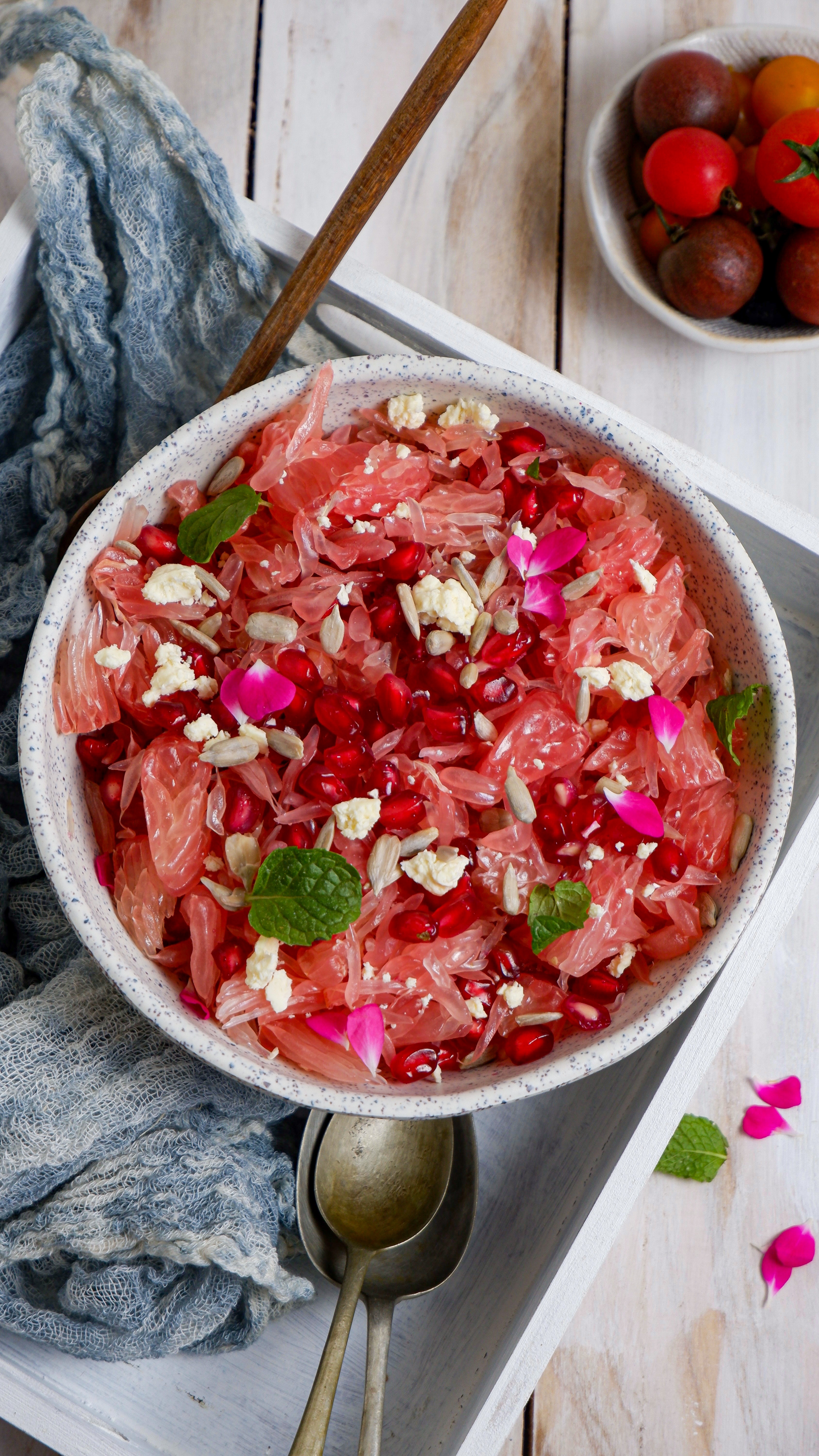 Pomelo Pomegranate Salad is seasonal fresh salad made of pomelo, pomegranate and some spices. This is extremely nutritious, enriched with vitamin C and fiber, which can aid digestion and help you feel full for a longer period of time after eating.