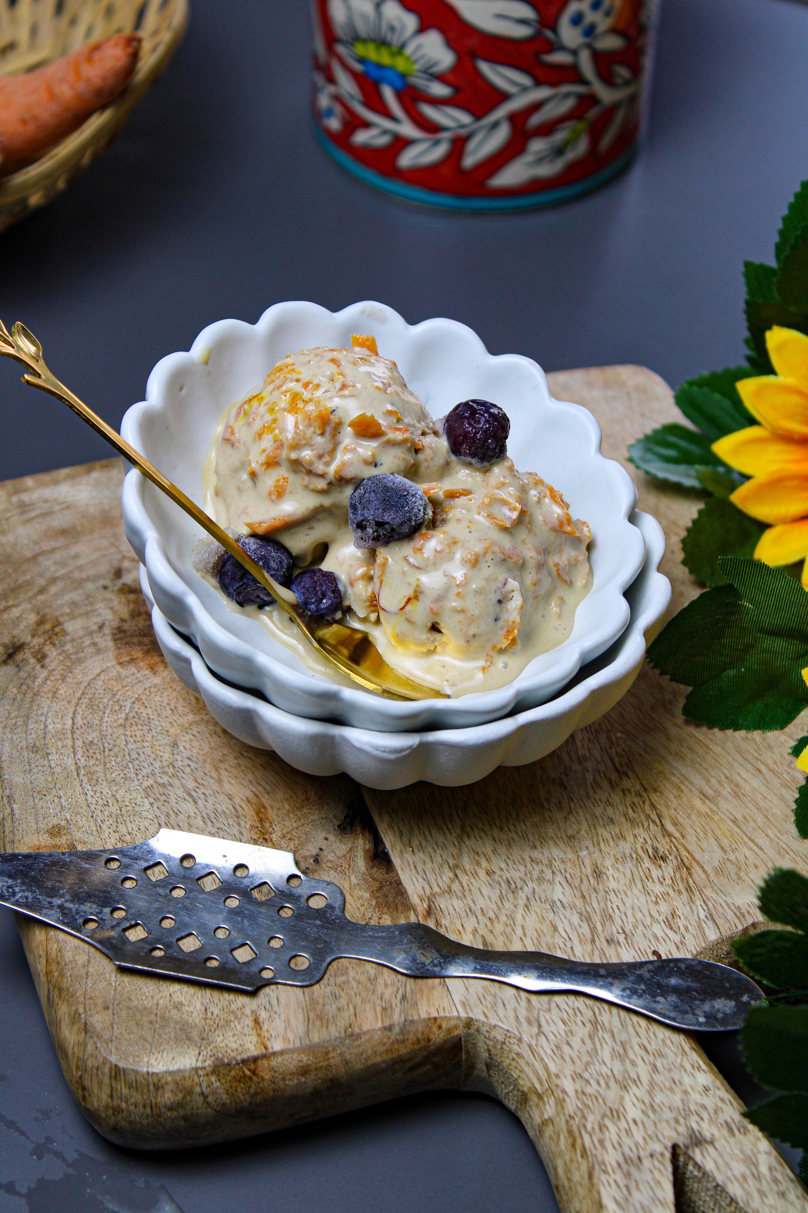 A2 Ghee Carrot Blueberry Ice-cream is a health icecream made of carrot, blueberries, jaggery , A2 ghee and spices.